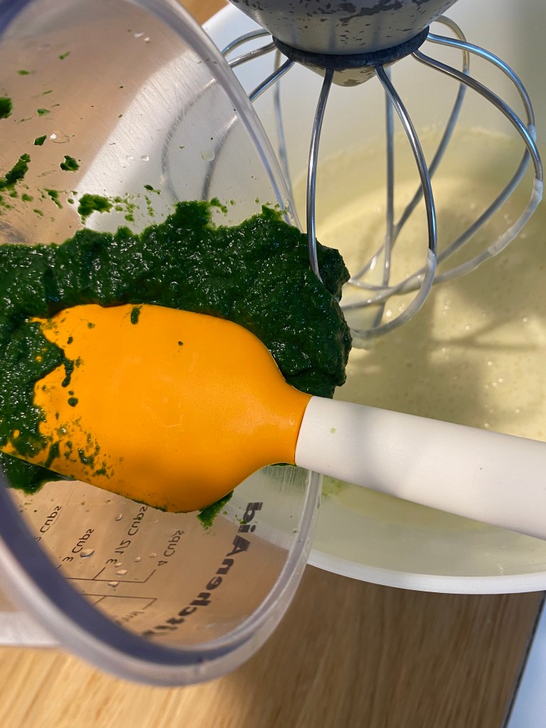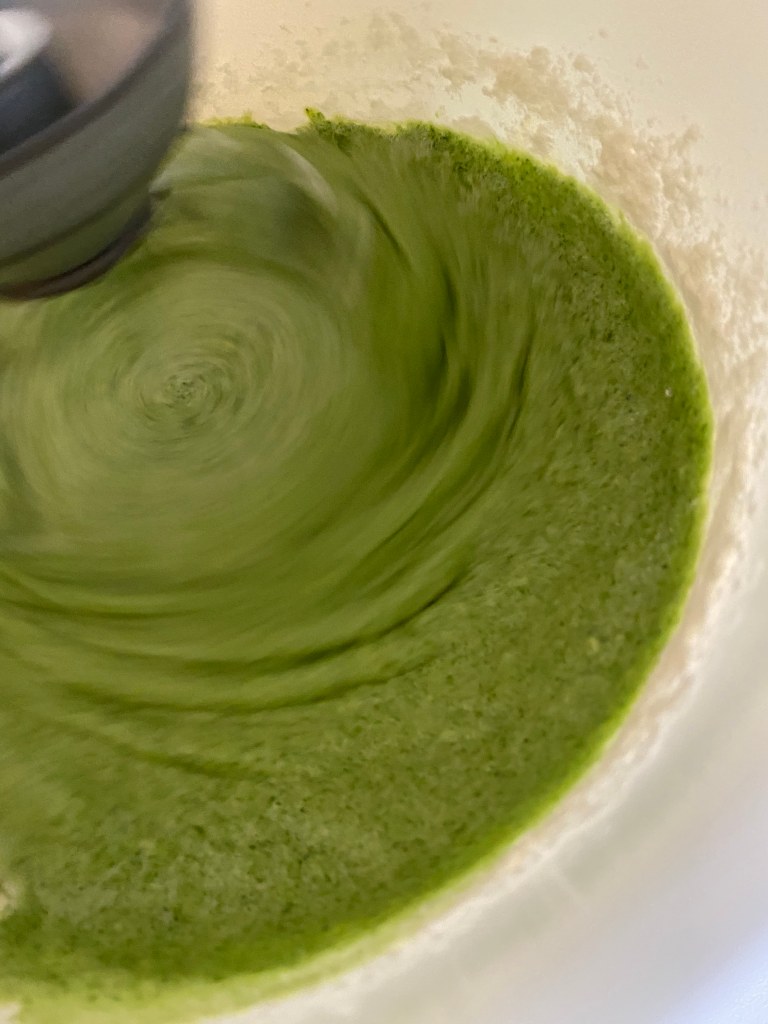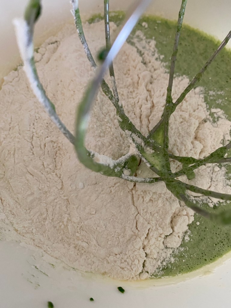 - Miltus sajauc kopā ar sāli un cepamo pulveri. Pieber spinātu mīklai un vēlreiz lēnām un kārtīgi samaisa.