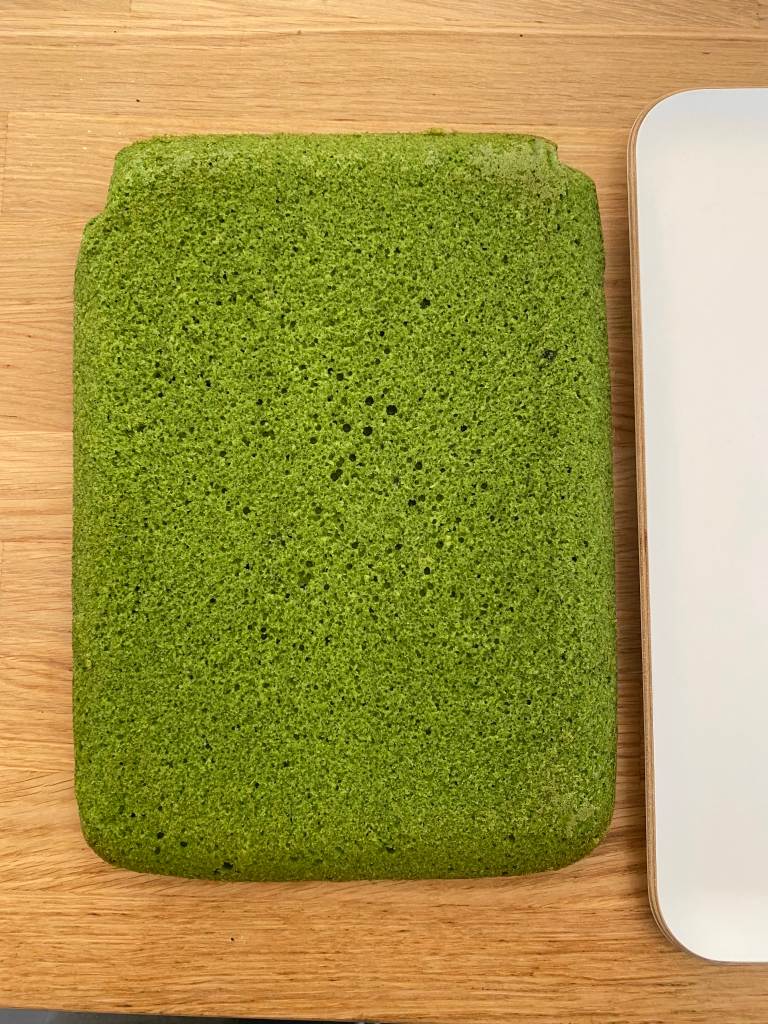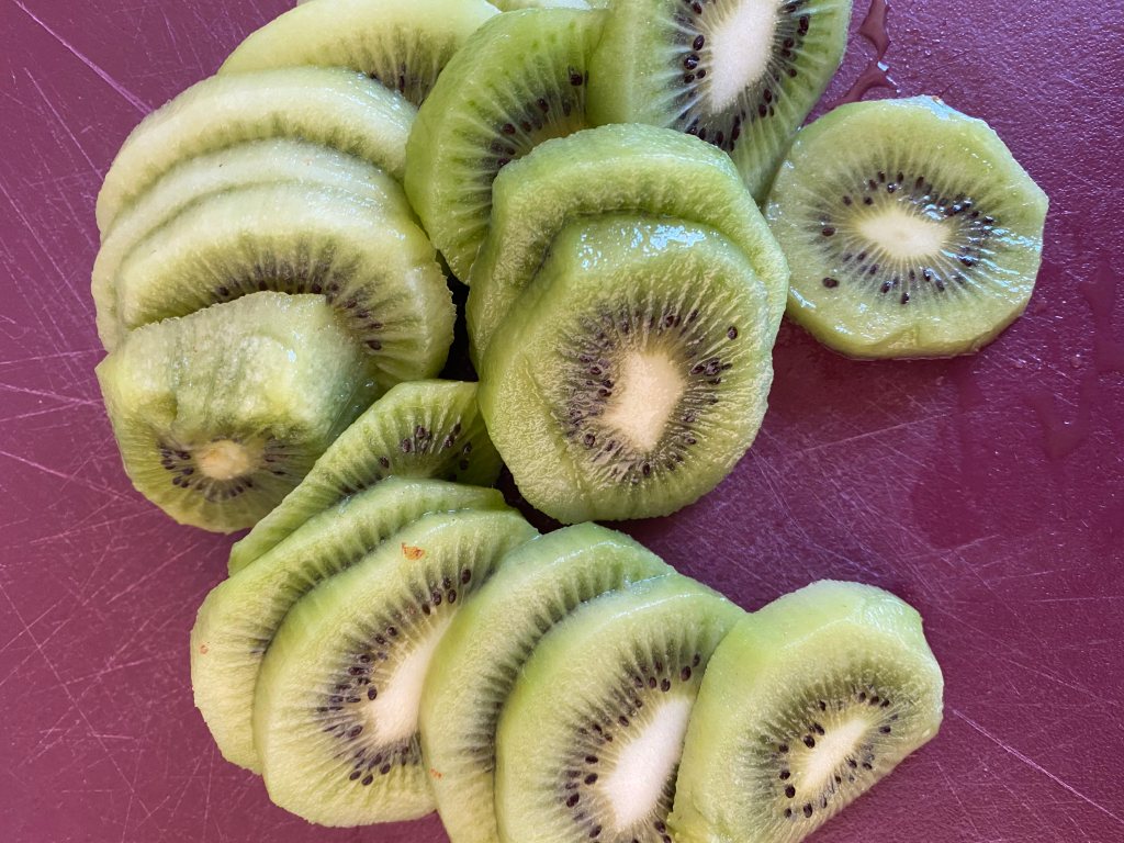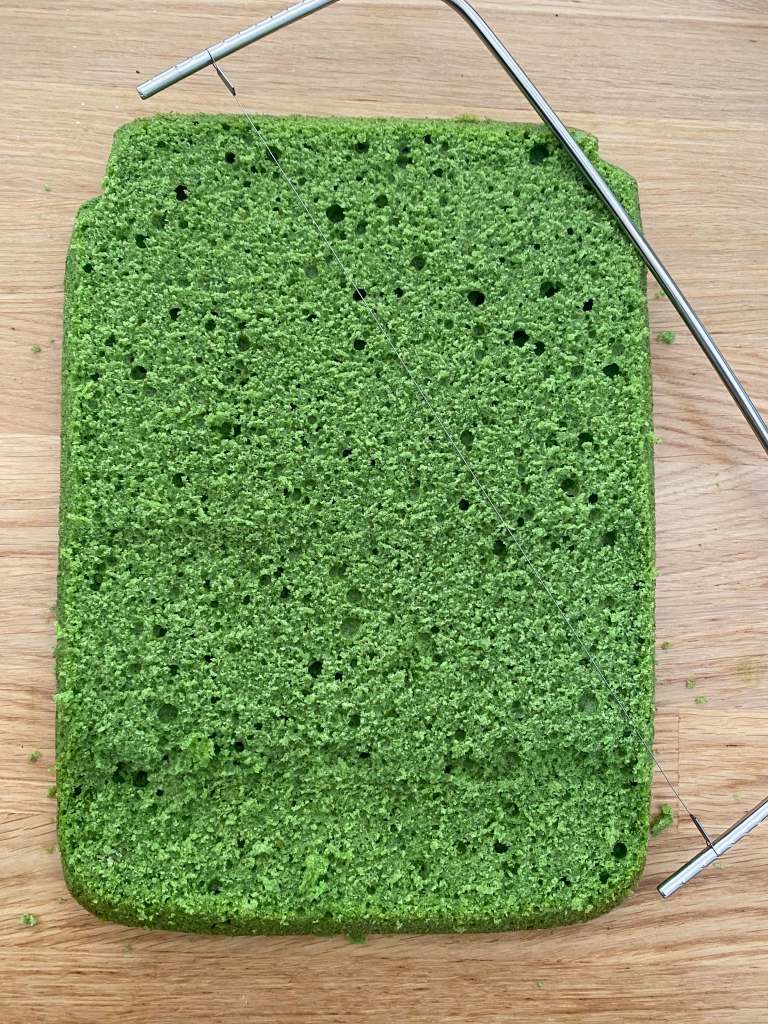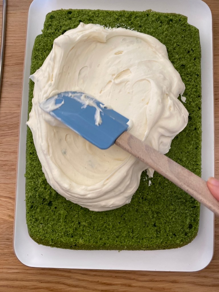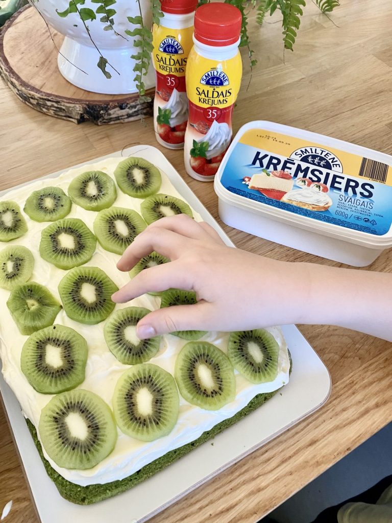 - Biskvītam nogriež augšējo trešdaļu un noliek malā. Uz biskvīta pamatnes liek sagatavoto pildījumu, izlīdzina vienmērīgā kārtā. Pa virsu liek kivi šķēlītes.