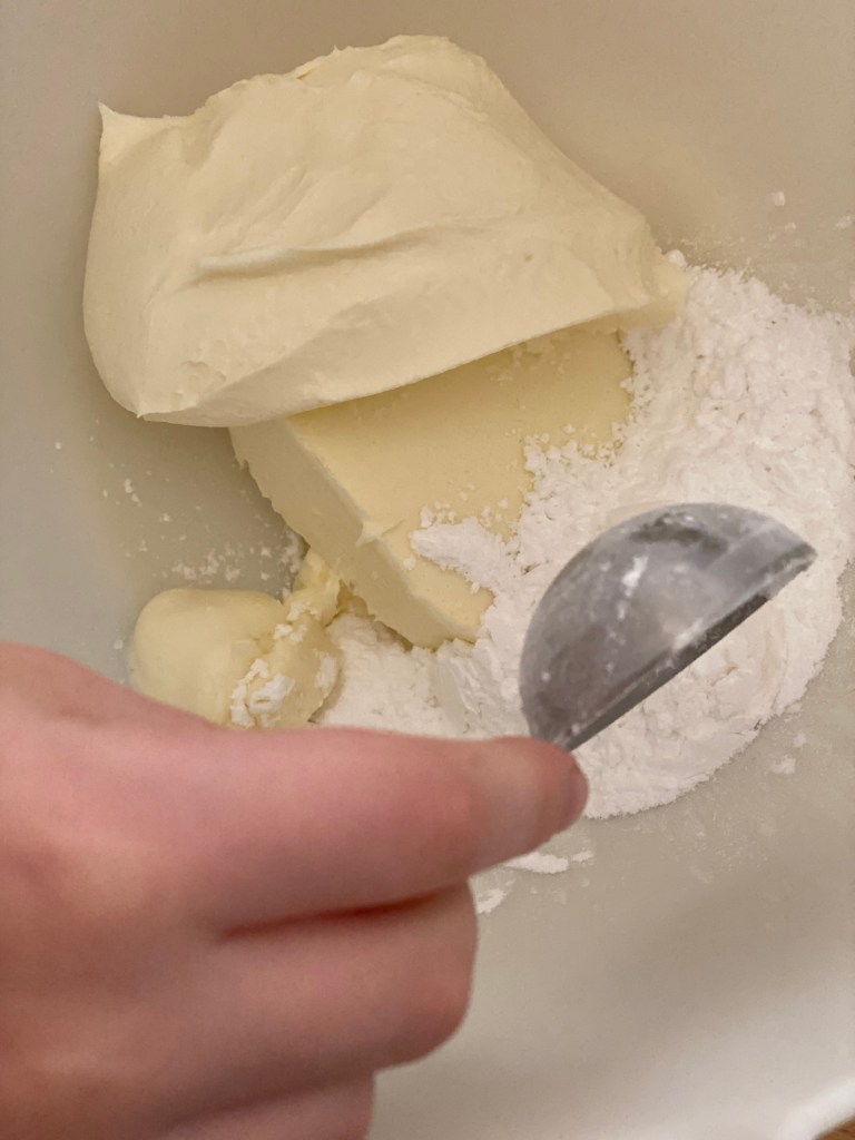- Krēmsieram pievieno cukuru un pūdercukuru. Saputo. Pievieno saldo krējumu un citrona miziņu. Turpina putot, līdz masas apjoms palielinās un sabiezē (jābūt krēmveida konsistencei).