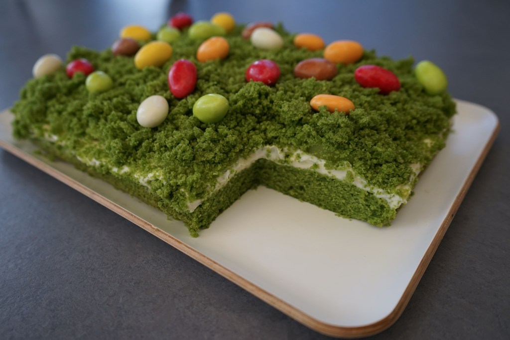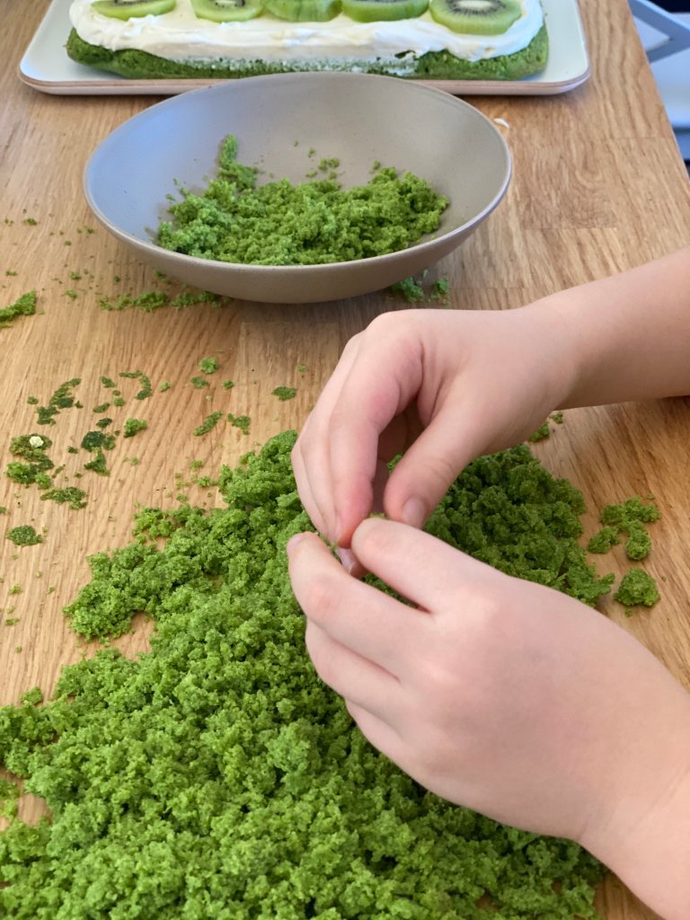 - Biskvīta augšējo trešdaļu ar pirktiem saplucina mazos gabaliņos. Liek vienmērīgā kārtā pa virsu pildījumam un kivi šķēlītēm. Dekorē ar ēdamām Lieldienu šokolādes vai krāsainām oliņām.