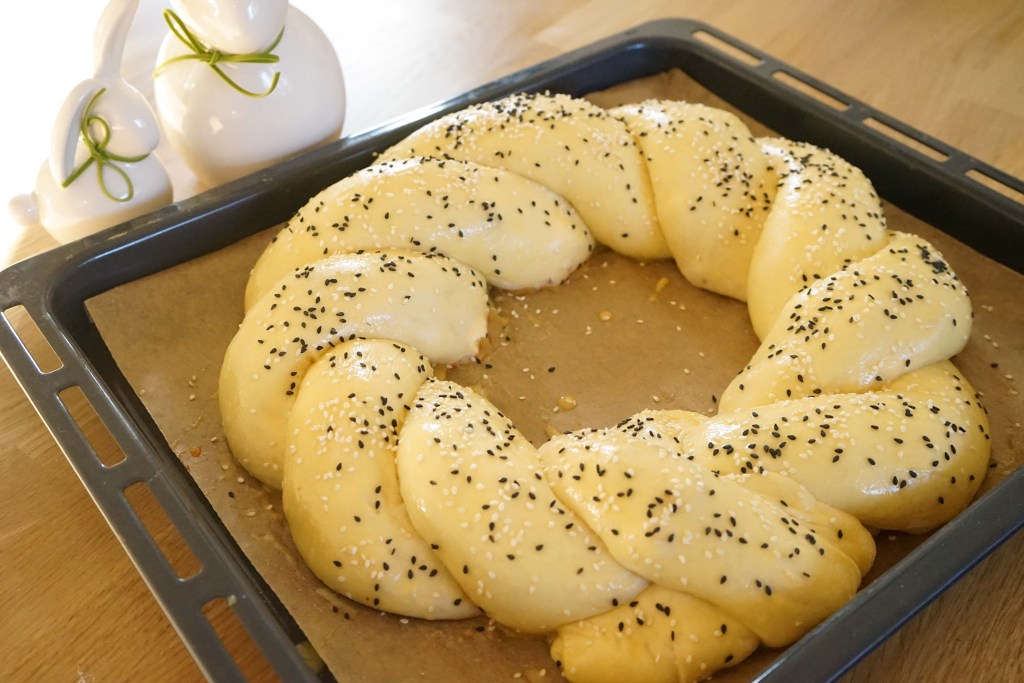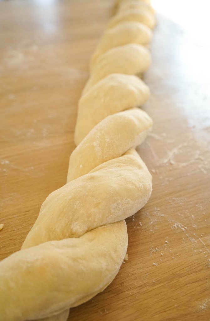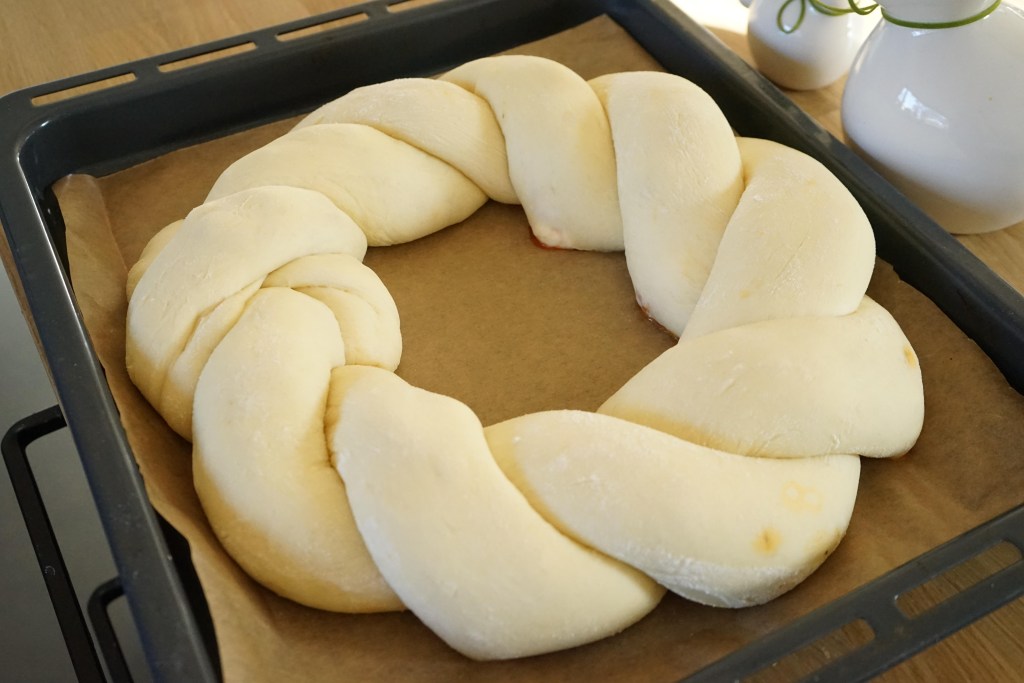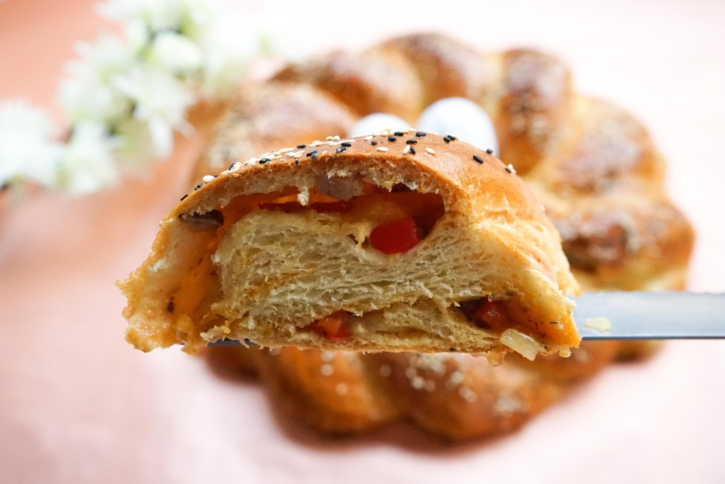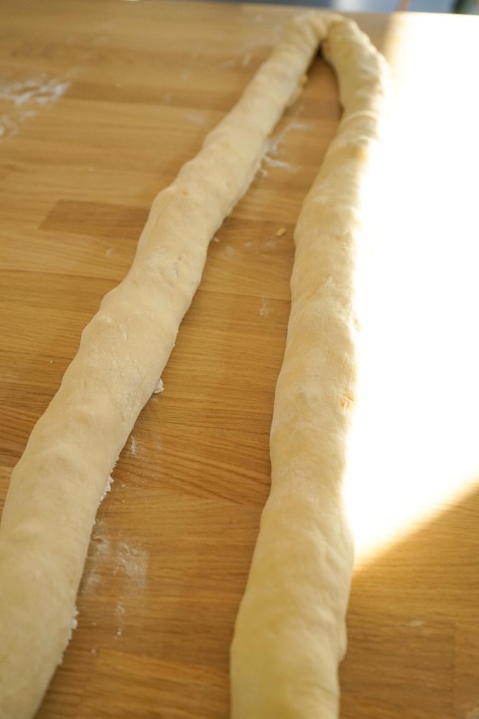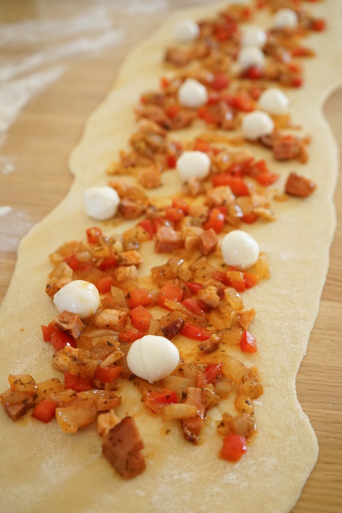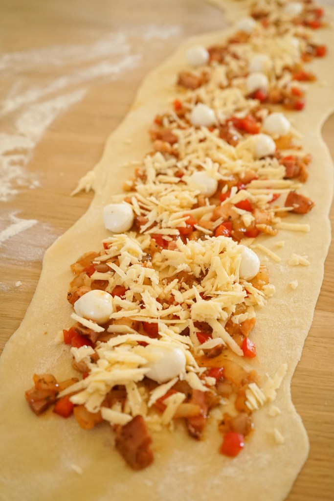 Darba virsmu izbārsta ar miltiem. Mīklu izveļ no bļodas un sadala divās vienādās daļās. Mīklu un mīklas rulli arī viegli pārkaisa ar miltiem un ar mīklas rulli no mīklas pirmās puses pēc iespējas vienādā biezumā izrullē 15×60 cm lielu taisnstūri (pirms rullēšanas mīklu nemīca). Pāri liek pusi no sagatavotā pildījuma, pāri liek saulē kaltētos tomātus, pārkaisa ar pusi no rīvētā siera, pa virsu tam liek pusi no morarellas bumbiņām. Sarullē garā desā (rullē garākajā virzienā). Visu procesu atkārto ar atlikušo neizrullēto mīklas daļu – rullē gareniski, piepilda un sarullē ciet.